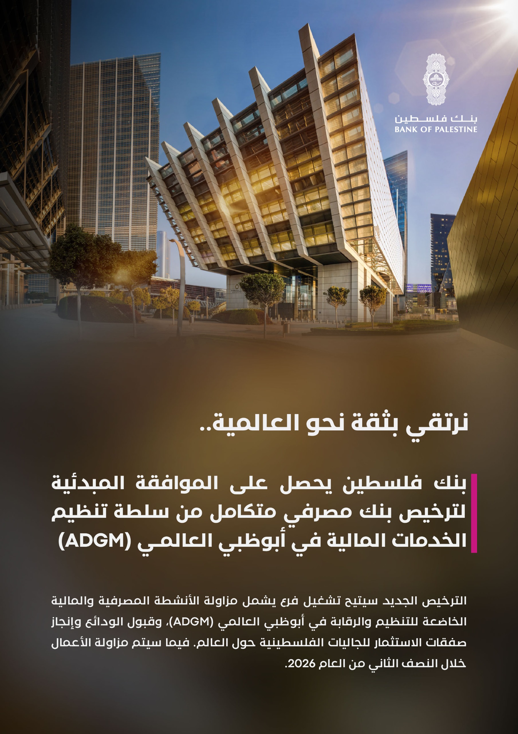 بنك فلسطين ينطلق نحو التوسع عالمياً بعد نيل الموافقة المبدئية على منحه ترخيص مصرفي متكامل من سلطة تنظيم الخدمات المالية في أبوظبي العالمي (ADGM)
